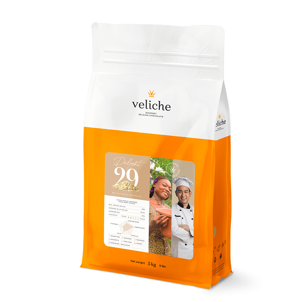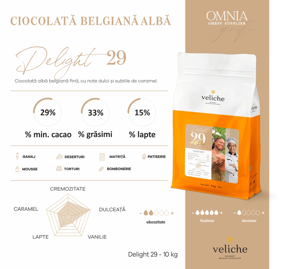Ciocolată albă belgiană fină, cu note dulci și subtile de caramel.